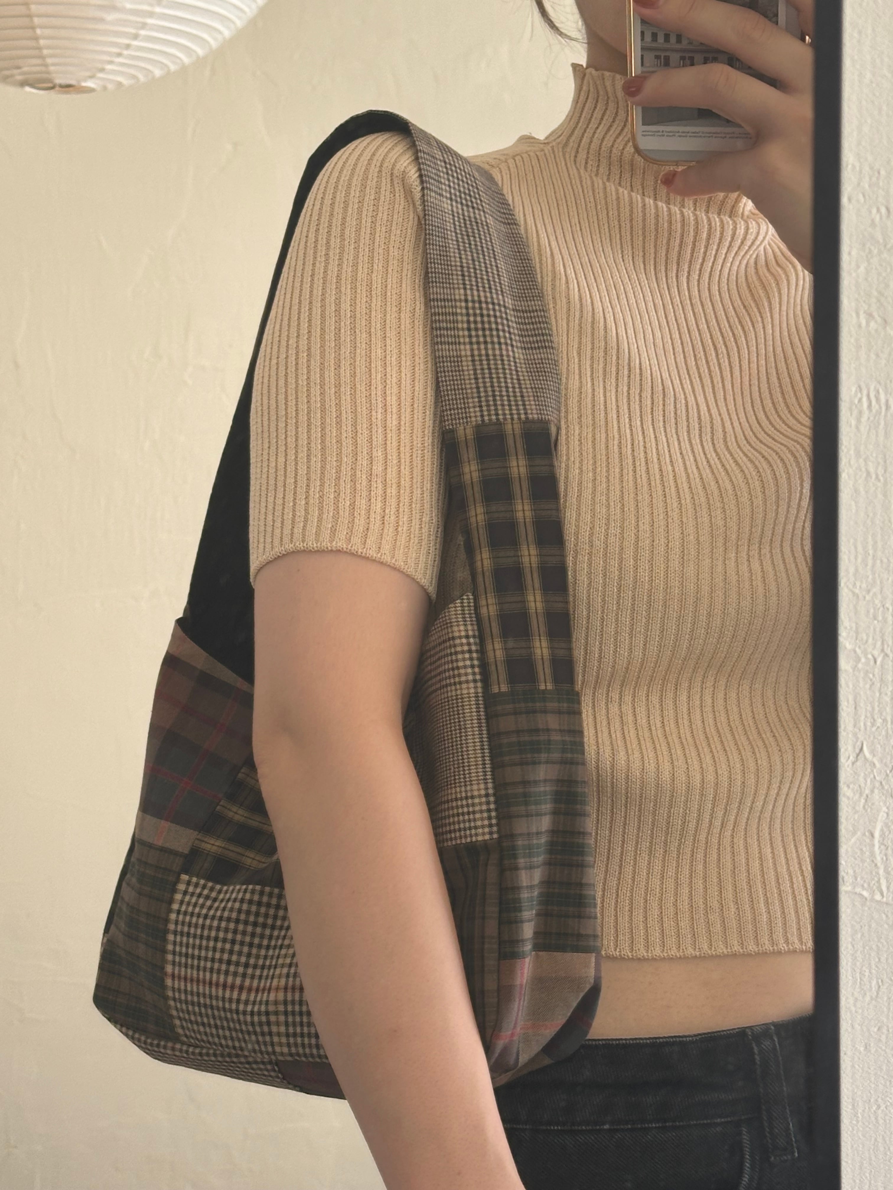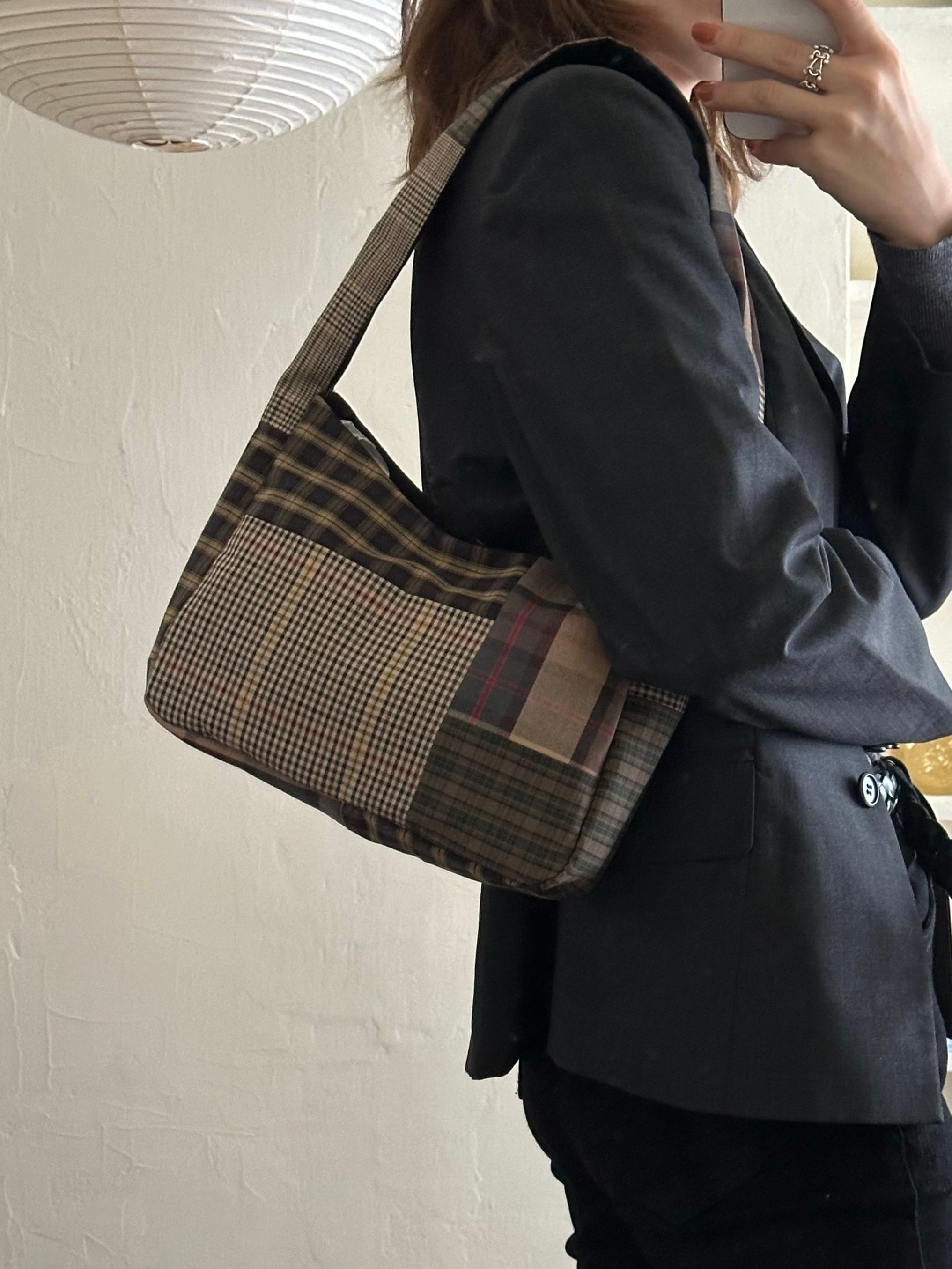 コットン地の数種類のチェックをパッチワークにした一点もののバッグ。