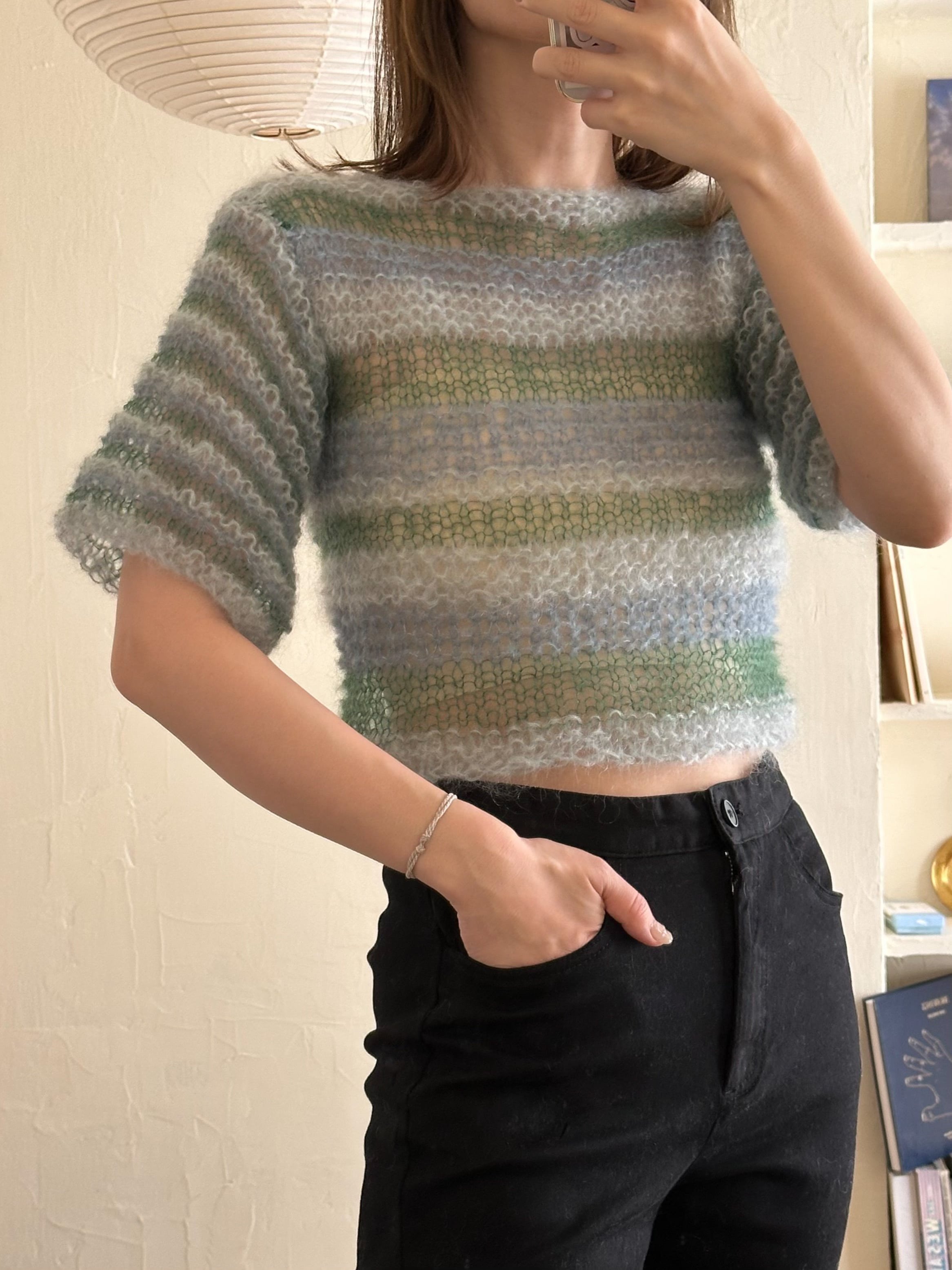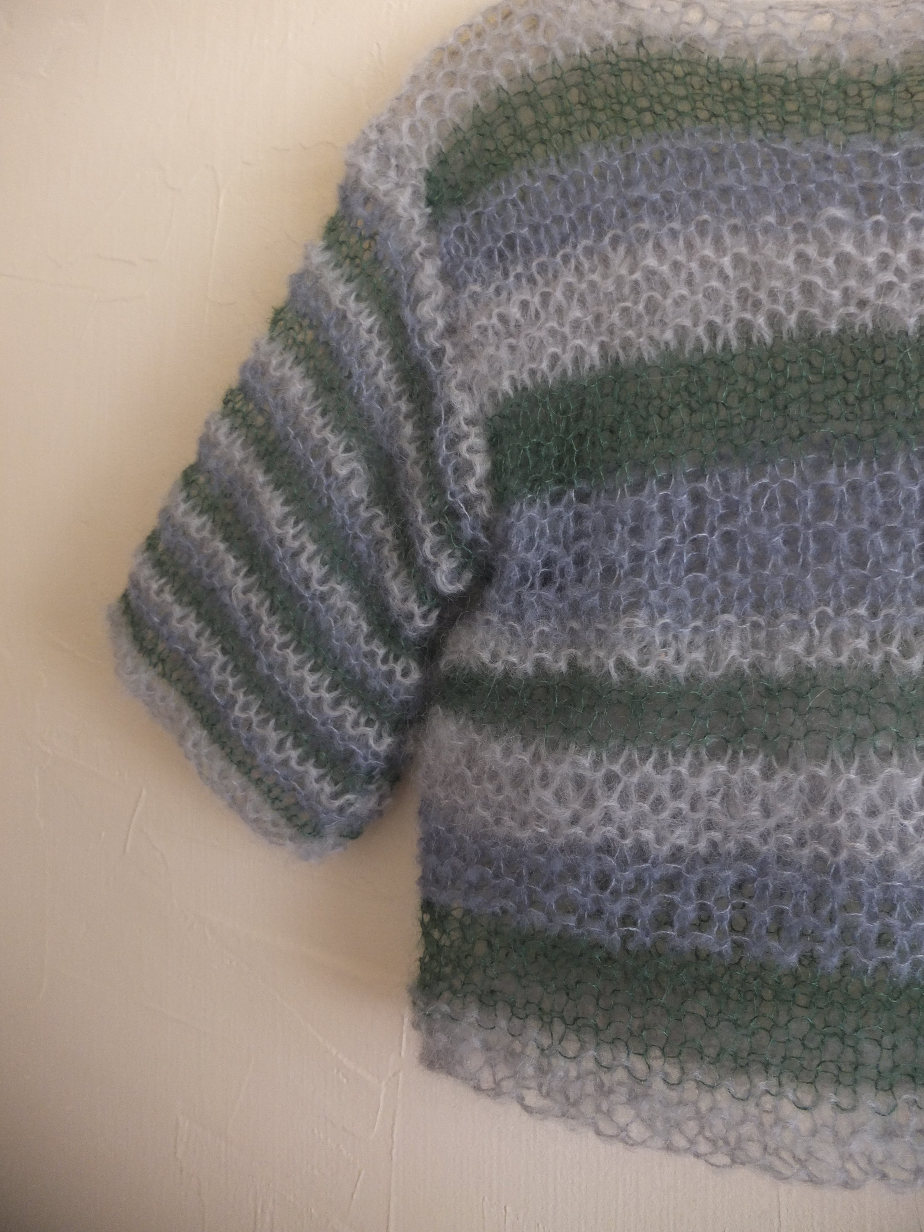 そのイメージを片隅に考えながらパリで偶然見つけたウールモヘアとシルクモヘア、数種類を組み合わせてふわふわの半袖のニットに仕上げました。